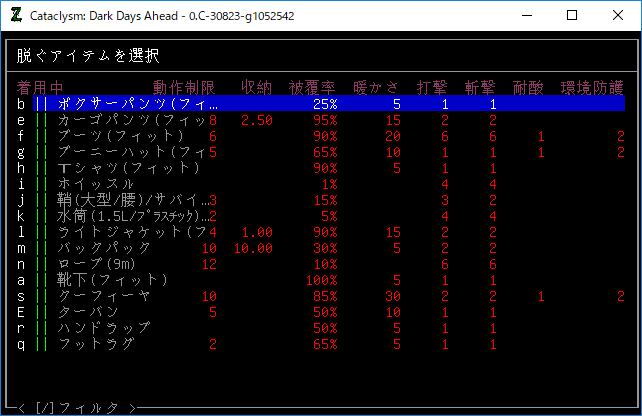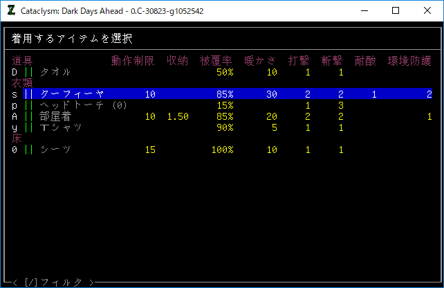 とりあえず持っていた衣類を装備してみました。wikiを見て衣服の性能を調べます。『動作制限』、『収納』、『暖かさ』は読んで字の如くだ。『動作制限』は低い方が優秀だろうし、『収納』は高い方が良い。『暖かさ』は季節によるのかな。『被覆率』は数値が多いほど防御力が高いと今は理解をしておく。『打撃、斬撃、耐酸』は各属性からの防御力?『環境防護』は高いほど優れている(はず)。
