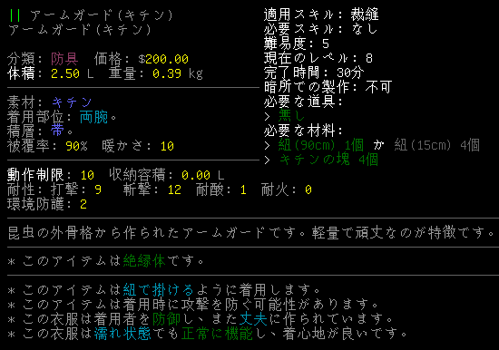 アームガード(キチン)をセバスチャンに装備させました。キチンの装備は万能だから気に入った!次にアリ塚を攻略する際はキチンをいっぱい回収しますね。