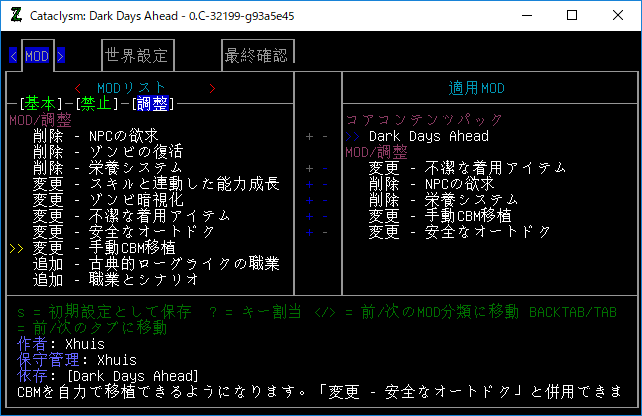 中世装備はクラフトに時間が掛かるから後回しにしよう。唐突だけど今回は既存世界に『手動CBM移植MOD』と『安全なオートドクMOD』を導入します。手動CBM移植MODの作者様は上の画像です。