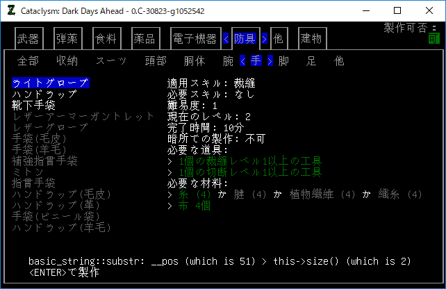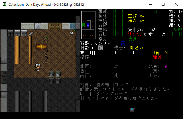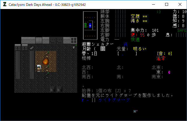 Cataclysmのプレイ日記を始めます。体を暖める衣服を作成中。アームウォーマーを作っている最中に日が暮れてしまいました。今回は夜に作業をする方法を覚えます。