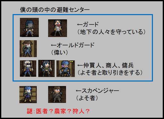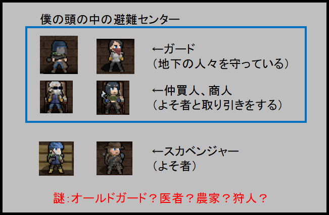 少しずつ避難センターの内情が分かってきたな。オールドガードは政府から派遣された護衛です。まあ実質、避難センターのリーダーみたいなものだろう。次回は盗賊クエストに挑みます。
