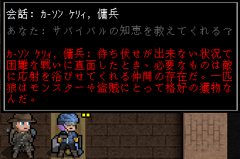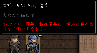 この変な格好をした人が傭兵のカーソン・ケリィだ。あまり強くは見えないけど(笑)、戦闘スキルが高いのかね。ちょっと話を聞いてみようぜ。