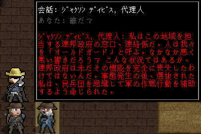 傭兵との会話は以上で終わった(短い)。次は代理人のジャクソン・ディビスとお話をしようぜ。赤く光る眼がただ者ではない予感をさせます。