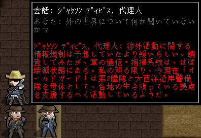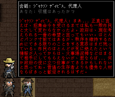 次は避難センターの北東に移動しよう。『傭兵』と『代理人』の2人がいますね。彼らと会話をすれば全ての住人と面会したことになる(医者はまだか)。