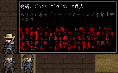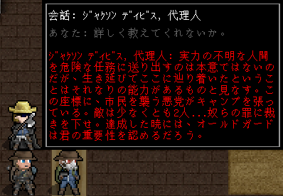 国に秩序を取り戻す正義の味方なんて素晴らしいじゃないか。俺もオールドガードの仲間に加わりたい。代理人からの依頼は積極的に引き受けることにしようぜ。ちょうど俺に頼みたいことがあるそうです。