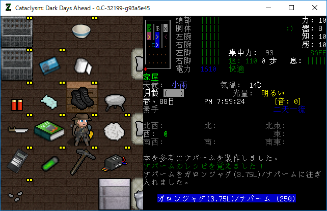 Cataclysmのプレイ日記を始めます。衣替えの季節が近づいてきました。拠点で防具の見直しをしましょう。火炎放射器を実戦に投入できるようナパームもクラフトしたいですね。