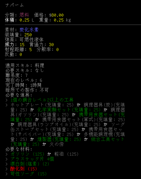 ナパームは1時間かけて250mlしか作れない。素材の確保も面倒くさそうだし量産するのは大変だろう。9ℓくらい欲しいんだけど素材が足りないよね(笑)。