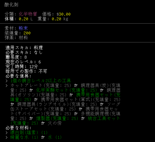 料理スキルが足らなくて酸化剤のクラフトに失敗する。2連続で失敗して材料を失ってしまったあ。漂白剤(塩素)はガロンジャグ2つ分しかありません。
