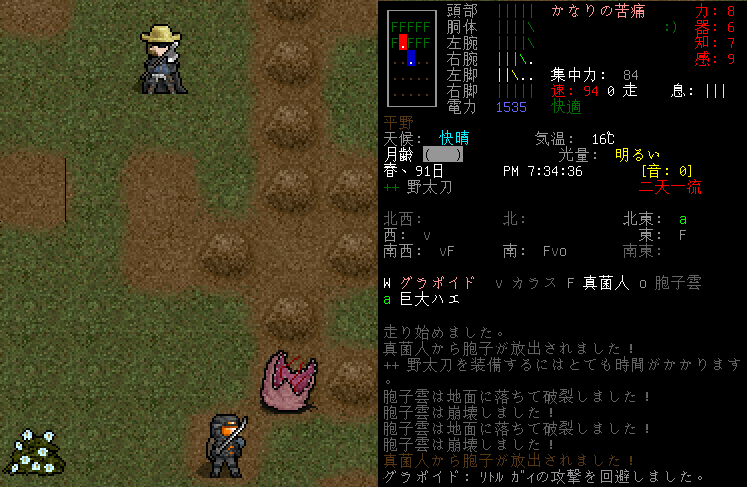 Cataclysmのプレイ日記を始めます。隊商が襲撃された現場に来ました。キノコのことばかり考えていたらグラボイドに攻撃されちゃった。マズいことにこのままでは殺されてしまいます。