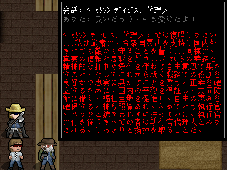 NPCの反応が冷たい(上の図)。しかも逮捕をするなとビビっています。NPCの反応が今までと違うぞ。執行官バッジを付けたら会話の内容が変化するの?