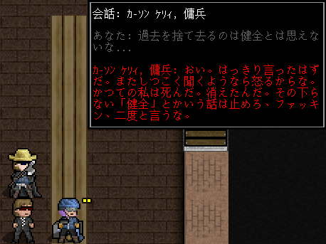これはトラウマを抱えた系のストーリーなのかな。ケリィに壮絶なバックグラウンドが付与されました。ファッキンと言われたのはイラッときたけど、NPCに愛着が湧いてくるシステムだ。