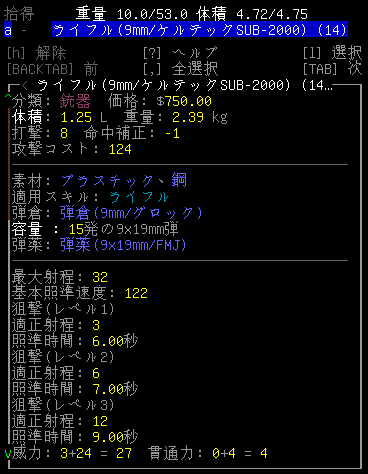 wikiによると『ライフル(ケルテックSUM-2000)』の弾倉は『ハンドガン(グロック19)』と同じらしい。弾薬は腐るほどあるしケリィに装備させる銃は決まりですね。