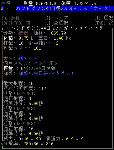 オールドガードから貰った『ハンドガン(ルガーレッドホーク)』の威力は40と高い。44マグナム弾の入手は困難だから扱いやすさは9mm弾ライフルの方が圧倒的に上でしょう。
