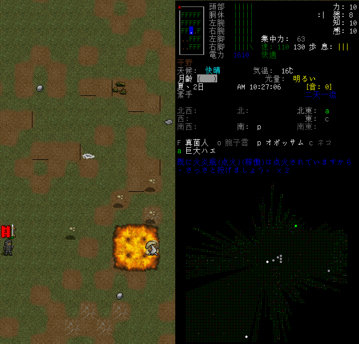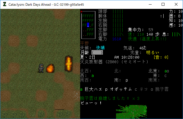 敵を焼き払う際はこちらも熱でダメージを受けます。高体温がジワジワと悪化していますね。このままだと速度の低下により死んでいたはずです。とあるCBMのおかげで命拾いをしました。