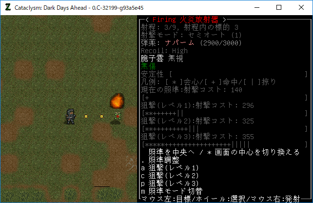 火炎放射器は基本的に狙撃レベル1で放っていました。狙いが定まらないせいか真っ直ぐ炎が発射されません。