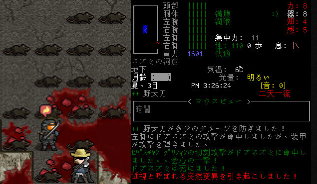 階段の位置から北へ進むとネズミの大群に囲まれてしまった。さすがにこの数を殲滅するのは厳しい。長期戦を覚悟しないとなあ。