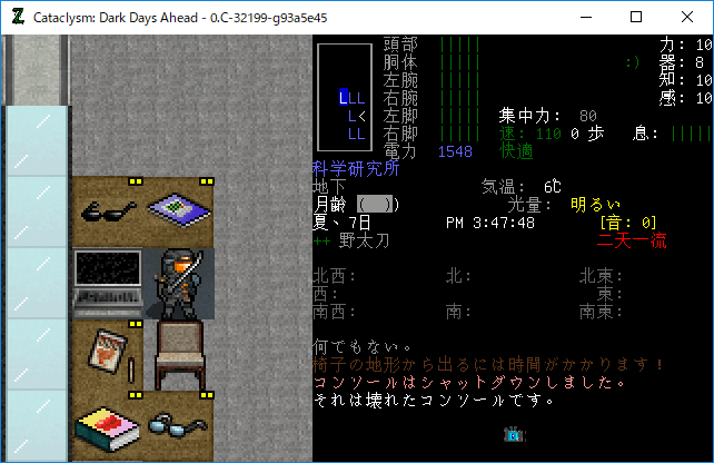 電源が入っているコンソールを操作したらシャットダウンしちゃった。コンピュータースキル5だと低いんだね。研究所には7くらいに上げてから来るべきだな。