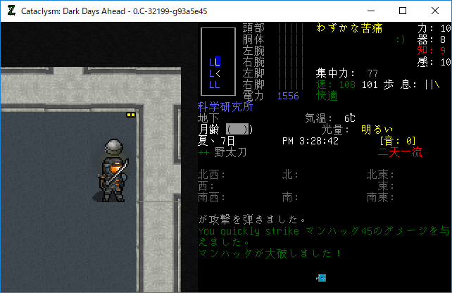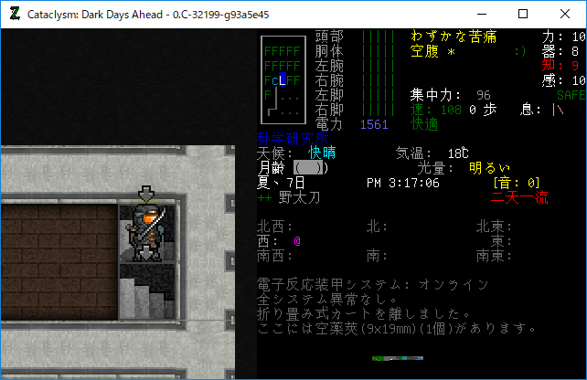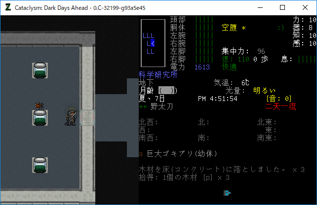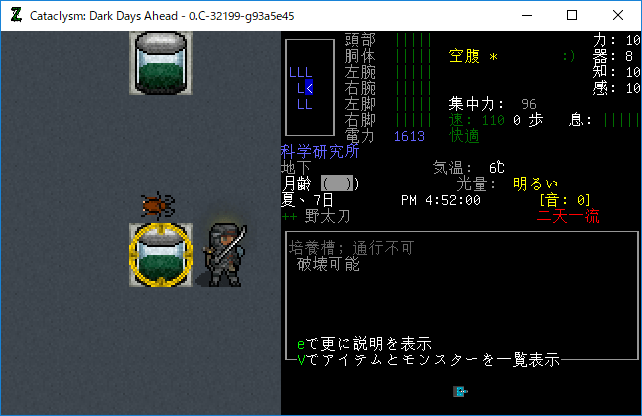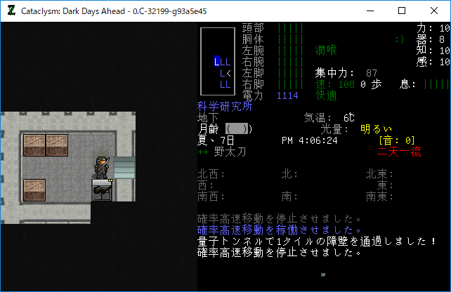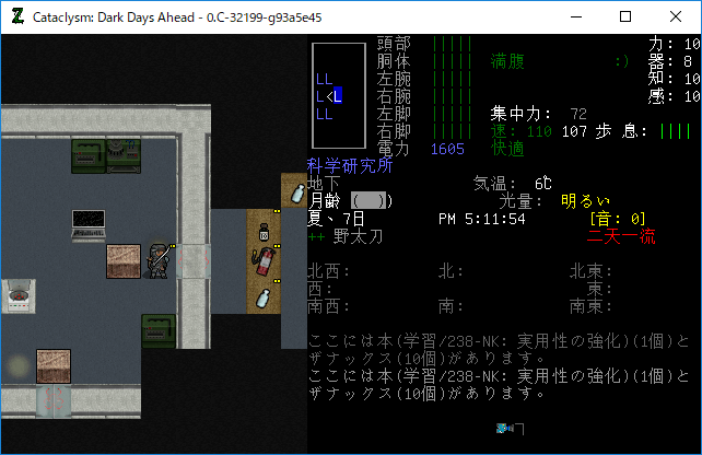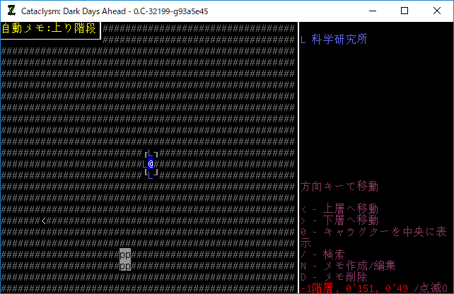 Cataclysmのプレイ日記を始めます。科学研究所の地下1階を探索中です。CBMや研究日誌をゲットして絶好調だ。まだタレット銃には遭遇しておりません。