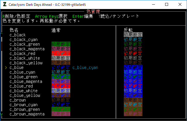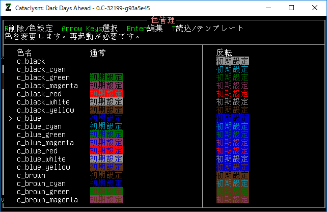 Cataclysmで使用されている文字色が表示されました(上の図)。背景が黒で濃い青の文字は『c_blue』です。c_blueを選択します。