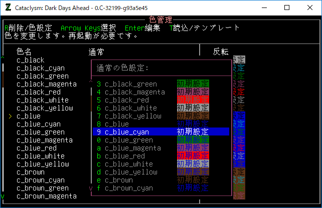 ウィンドウが表示されて文字を選択できるようになりました。ここで明るい赤、青、緑を選ぶと読みやすくなるのかな。今回は元の色に近い『c_blue_cyan』を選択します(現在の開発版だとc_cyan)。