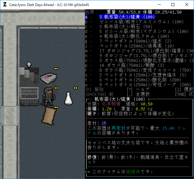 拾ったアイテムは種類別に分けておきます。薬品類は過剰なくらい集まったね。もう塩素、アンモニア、苛性ソーダは充分だろうな。