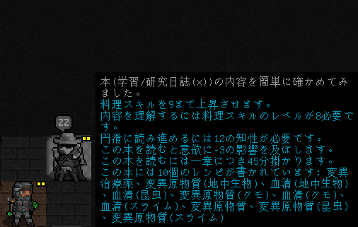 研究日誌(x)のレシピはわりと普通だった。エルファの血清が作成可能ならば充分だと自分を慰めておこうか。次回は兵舎を調べて科学研究所に別れを告げます。