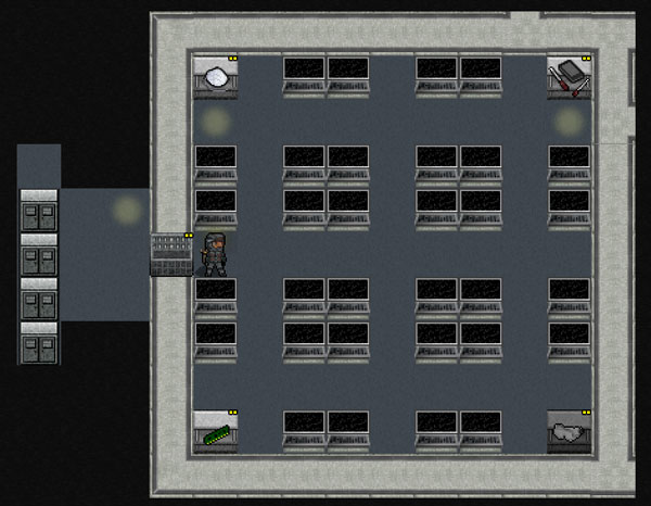 Cataclysmのプレイ日記を始めます。今回も科学研究所のアイテムを拾い集めます。オートドクの部屋でカートがいっぱいになっちゃった。いったん階段に戻りましょう。