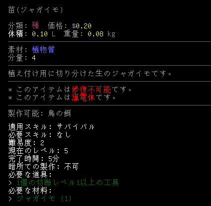 もしかしてジャガイモには種が無いのかな(笑)。デバッグモードで調べてもジャガイモの種はありません(笑)。ジャガイモを植えるには苗が必要なんですね。