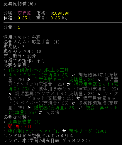 変異原物質(鳥)の素材には『卵(鳥)』が必要みたい。鳥の卵なんて見たことねえぞ!まあ森に行けば落ちているのでしょう。いつかグルメハンター回をやります。