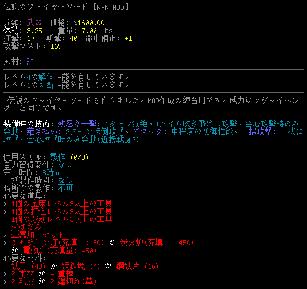 tile_config.jsonを改変したら伝説のファイヤーソードが見えるようになった!剣しか作ってないけど今回はこれで終わり。grepでツヴァイヘンダーのレシピを探したら疲れたあ。次回は銃のタイルを検証します。