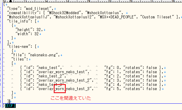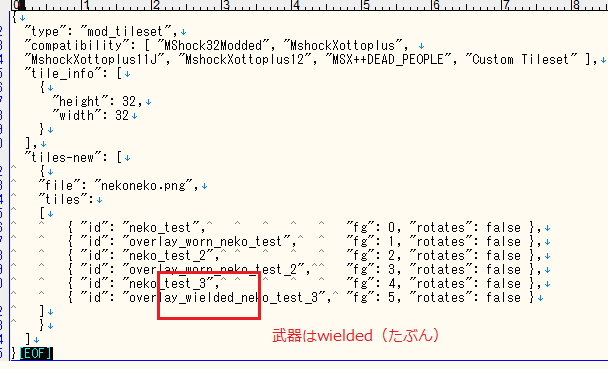 武器にタイルを反映させているMOD(KawaiiMaidMod)のtile_config.jsonを調べてみよう。どうやら武器は『overlay_wielded_』にしなくちゃダメみたい。『overlay_worn_』は防具系のタイルに使うのだろう(たぶん)。