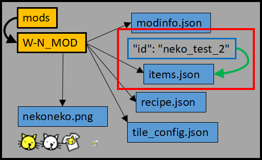 現在の進捗状況を確認しよう。items.jsonとrecipe.jsonにポーチとTシャツの性能とレシピを記述したんだよね。そしてポーチとTシャツのpngを用意してtile_config.jsonにて対応させたのだ。