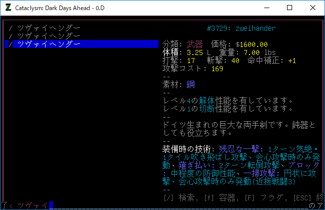 さて、無事にMODが導入されました。ツヴァイヘンダーの性能をそのままコピペしたのはプレイ日記で使用するからです。例えば『ツヴァイヘンダー改』という名前に変えてオリジナルのドット絵をつけたい。
