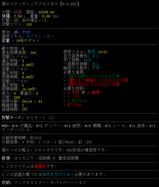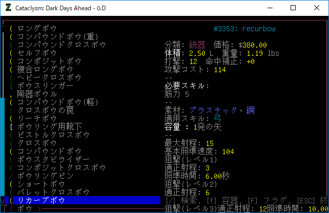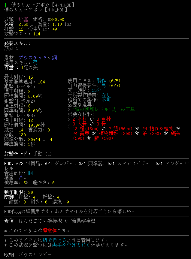 無事にMODが読み込まれたようです。弓のフラグも銃に劣らず複雑だよなあ。リカーブボウの性能は\data\json\items\archery.json、レシピは\json\recipes\recipe_weapon.jsonに記載されています。