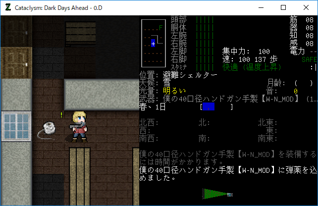 装備した際のタイルも反映された。items.jsonを書き換えればオリジナルの拳銃が完成するぞ。そんなものを作ったらゲームバランスが崩壊しちゃうか。