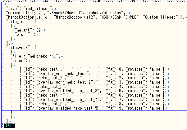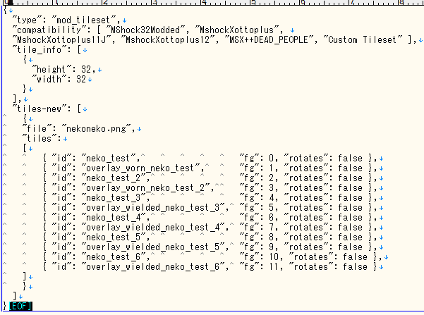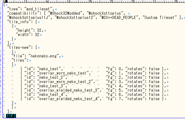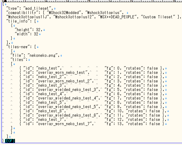 手製ハンドガンのIDはneko_test_4です。tile_config.jsonのfg6~7にIDを割り当てよう。これだけで下に拡大したpngファイルを読み込んでくれました。
