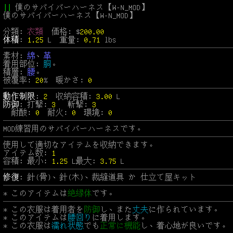fg12~13にID:neko_test_7を割り当てます。サバイバーハーネスは防具だから『overlay_worn_』ですね。性能は\data\json\items\armor\holster.json、レシピは\data\json\recipes\armor\storage.jsonにあります。