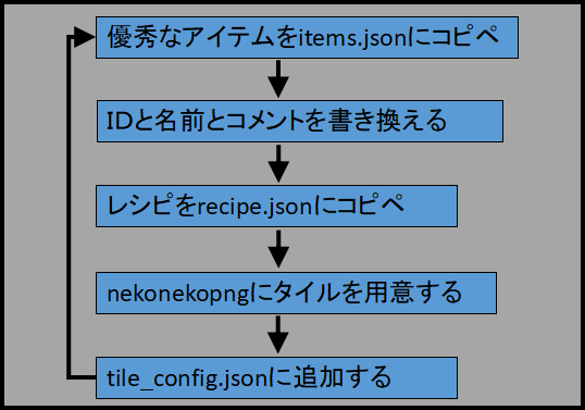 タイルの反映は無事に完了。今回はコピペばかりの意味不明な回だったなあ。items.jsonのフラグを調べられたし個人的には満足しています。