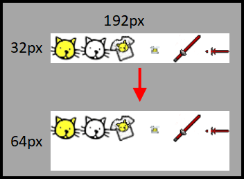 足し算をするのでお待ちください。えーと、タイルは32pxの正方形だから縦の幅を64pxにすればよろしい。この作業をした時に上の段のタイルがズレちゃった。最初からサイズの大きいpngファイルを用意するべきだった。