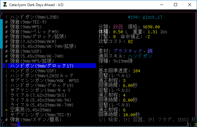 ハンドガン(9mm)は優秀な銃だろう。グロック17のjsonをMODに加えたい。grepで検索したけど不思議なことにレシピが見つかりません。正規の銃はクラフト不可能なのを忘れていた(笑)。