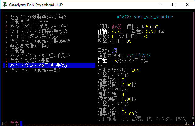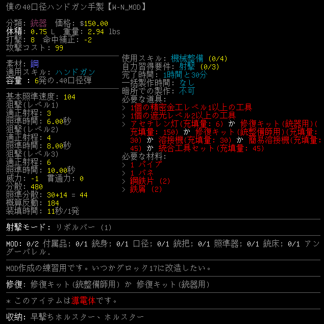 40口径手製ハンドガンの性能は『\data\json\items\gun\40.json』、レシピは『\data\json\recipes\recipe_weapon.json』に書いてあります。items.jsonを書き換えて9mm銃に改造できないかな。