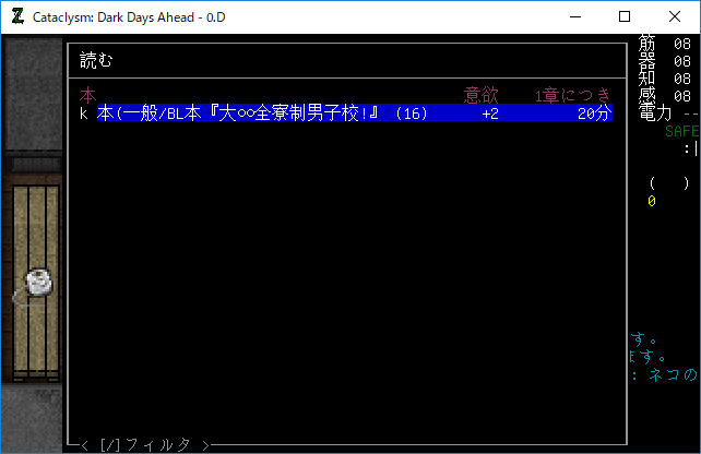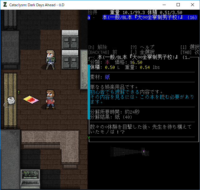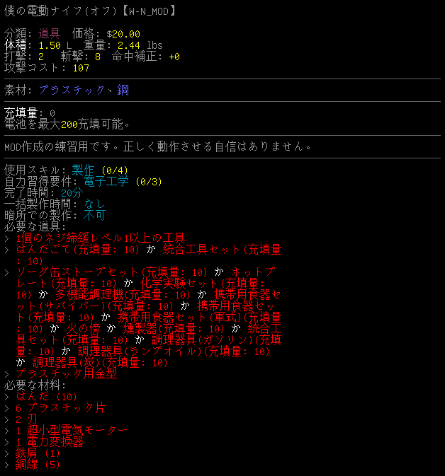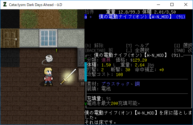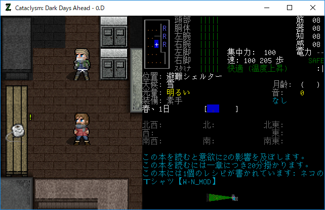 Cataclysmのプレイ日記を始めます。一番難しいだろうと悩んでいた人間のタイルを変更できた。今回はMOD作成の最終回になります。レシピ本と電池の装備にタイルを対応させれば完成です!