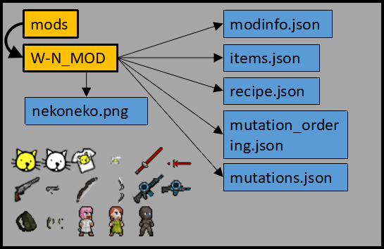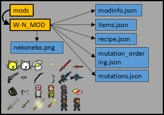 現在の進捗状況を確認します。W-N_MODフォルダに『mutation_ordering.json』と『mutations.json』を加えました。人間のタイルを変更できて本当に良かった。何から手をつけるべきか分からなくて1回諦めました。