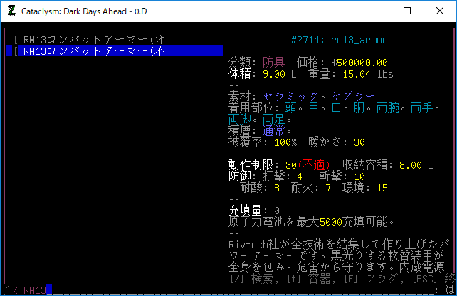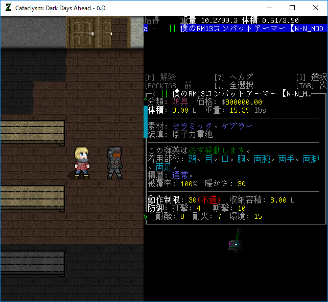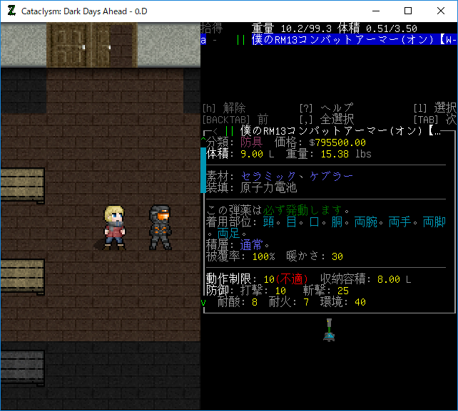 装着をしてオンにしたタイルもオーケー。ちゃんと動作制限は下がっていました。本物のコンバットアーマーとはIDが違うからゲーム内では別の装備ということになっています。