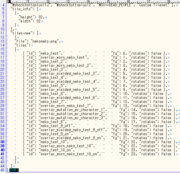 ではでは、電池式の武器にタイルを対応させます。適当な武器のitems.jsonをコピペしてみましょう。真似する武器は電動ナイフを選びました(ID:carver_off、carver_on)。