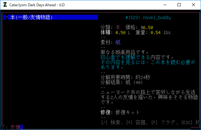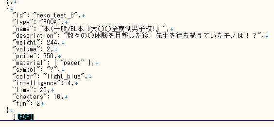 『一般/友情物語』のコードは『data\json\items\book\misc.json』に書いてあります。items.jsonにコピペをしてID、タイトル、コメントを変えました。本のタイトルは先ほど俺が読んだものに変更しておいたよ。