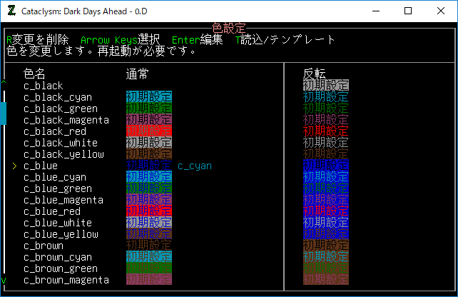 レシピ本を読んだ結果はc_blueで表示されます。c_blueは薄暗くて読みにくいからc_cyanに変えよう。文字色はタイトル画面の設定で変更できます。俺が普段使っているバージョン7928と配色が違う...。