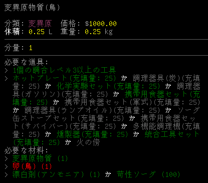 ついでに『変異原物質(鳥)』も車内で作れるようにします。クラフトする前に卵が腐敗したら立ち直れないからね。こいつもアンモニアが素材になります。