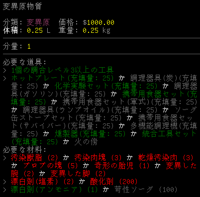 ブロブの塊が枯渇しそうになったのは上の『変異原物質』のせいだ。こいつをブロブの塊でクラフトしていたのは見通しが甘かった。塩素とアンモニアとホットプレートがあれば車内にて製作できます。