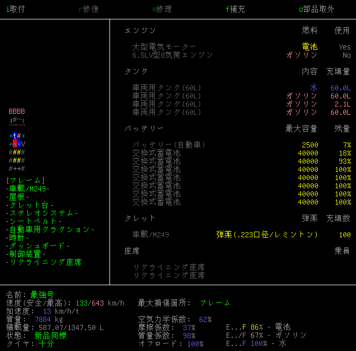 今回のプレイ日記はここで中断。久しぶりに最強号の様子を確認しましょう。ハイブリッドカーにしてから1滴もガソリンを消費していません。ガソリンタンクが2.1Lになっているのは図書館に突っ込んだからです。